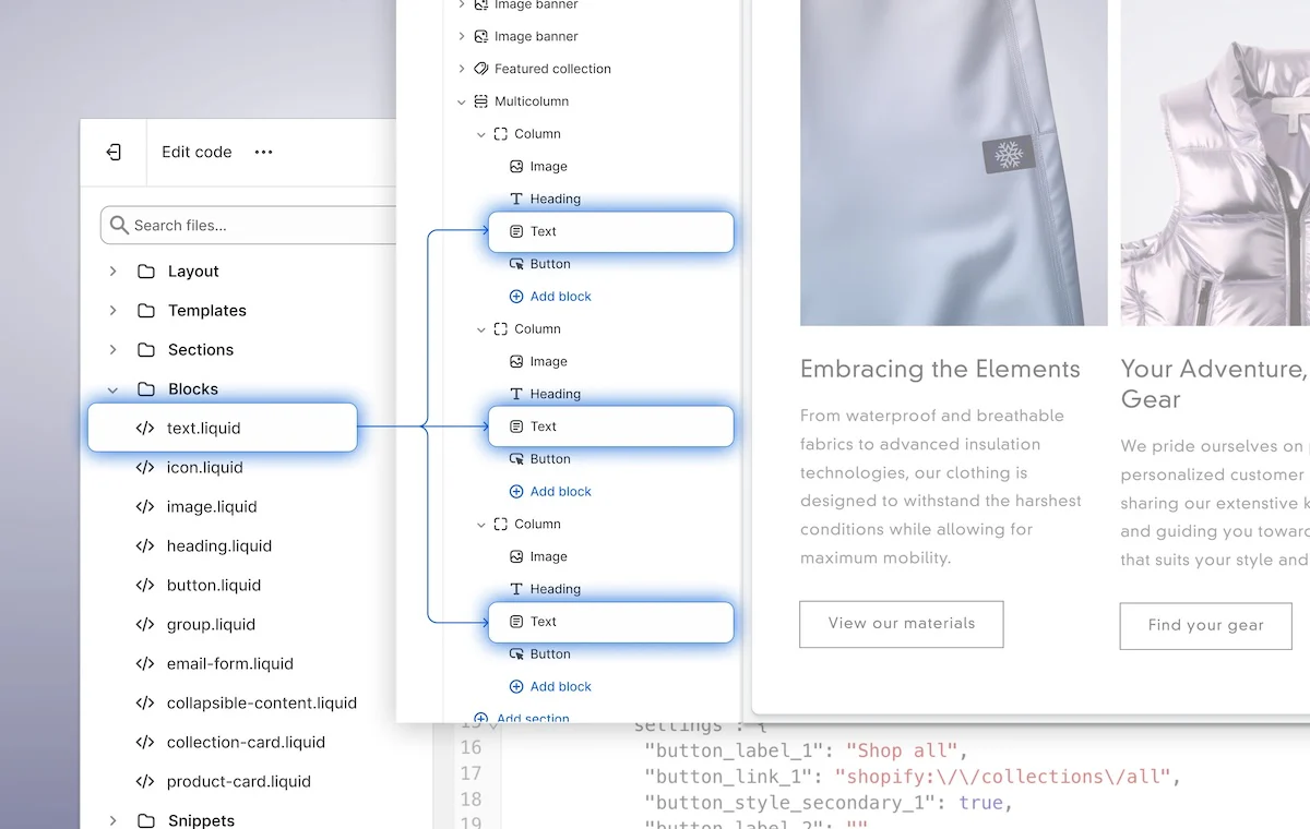 `li-cf-theme-blocks` offers an even more flexible way. It’s based on [Shopify’s new feature](https://shopify.dev/docs/storefronts/themes/architecture/blocks/theme-blocks/quick-start) that allows blocks to be nested.